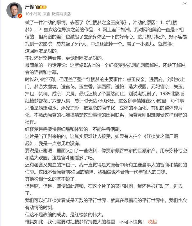 另外,教授也说道该片也是有着打动自己的时刻。但在他看来,这不是改编的成功,是红楼梦的伟大。