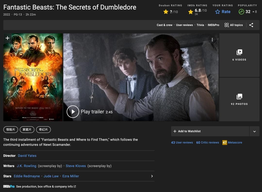虽然受疫情影响,多地影院已经停止营业,但定档4月8日率先于国内上映的《神奇动物在哪里3:邓布利多之谜》已经开始播放,目前影片口碑已解禁(豆瓣评分暂未放出),烂番茄新鲜度60%,IMDB 6.8,MTC是47分,ING也只有4分。