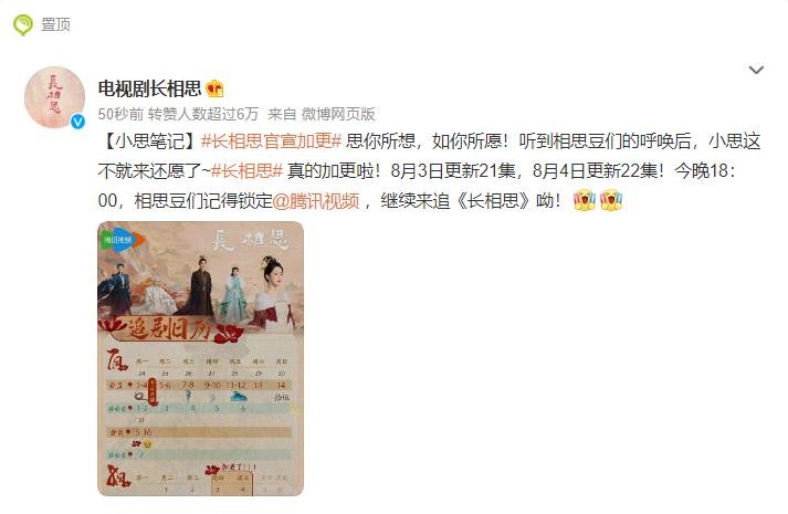 8月2日,据电视剧长相思官方微博消息:长相思将加更,8月3日更新21集,8月4日更新22集!
