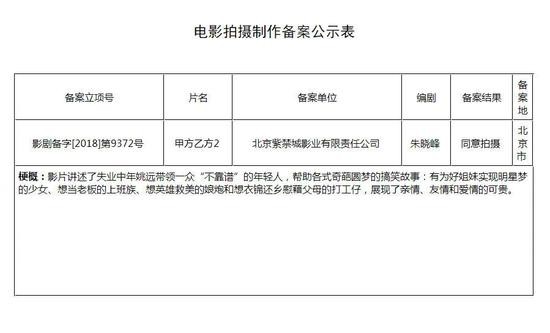 据电影局备案公示,《甲方乙方2》由北京紫禁城影业备案立项,编剧显示是朱晓峰,影片讲述失业中年姚远带领一众“不靠谱”的年轻人,助人圆梦的故事。有媒体曾就影片立项一事求证冯小刚方面,对方宣传总监回应称:“(《甲方乙方2》)跟冯小刚无关,看到网上新闻才知道这个项目。”