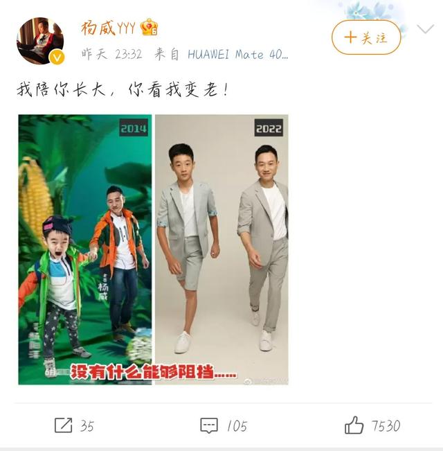近日,奥运冠军杨威更新个人社交平台,晒出自己与儿子杨阳洋的八年前后对比照,配文写着:“我陪你长大,你看我变老!”时间真是个神奇的东西,原来杨威带杨阳洋参加《爸爸去哪儿》已经过去八年了,如今杨阳洋也从曾经的软萌乖巧变为现在的阳光帅气了。