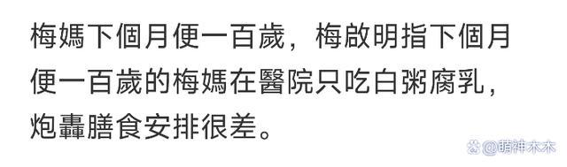 不过,一提到 99 岁梅妈,他又变得中气十足,生气地表示:" 我出事后都有朋友通知了她,但她一个近身护士截所有的消息,还说母亲痴呆。几日前母亲打(电话)给我,说她身边有很多马鬼蛇神,也很害怕没了一个护士,因为她不会吃药。" 梅启明同时表示梅母的护士对母亲照顾得差,女朋友去探望梅母,看到梅母的伙食非常差,吃稀饭和腐乳,没有营养,梅启明更扬语言出院后要找护士算账。
