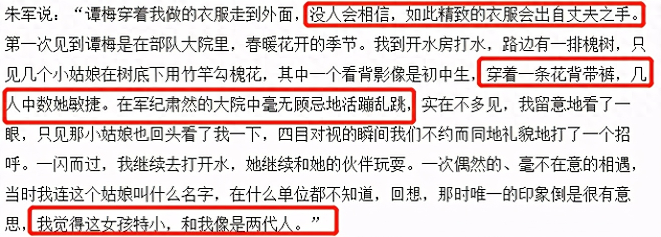 谭梅年轻时其实就是个美人胚子,学习舞蹈的天生爱美,据悉她和朱军初次见面的时候穿的是一条花背带裤,在庭院里勾槐花,活泼的样子差点让朱军以为她只是一个初中生,但实际上两人年龄只差6岁。