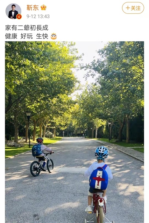 实际上靳东并没有忘记生日这么重要的日子,他在前一天就晒出两个孩子骑自行车游玩的照片为小儿子庆生。