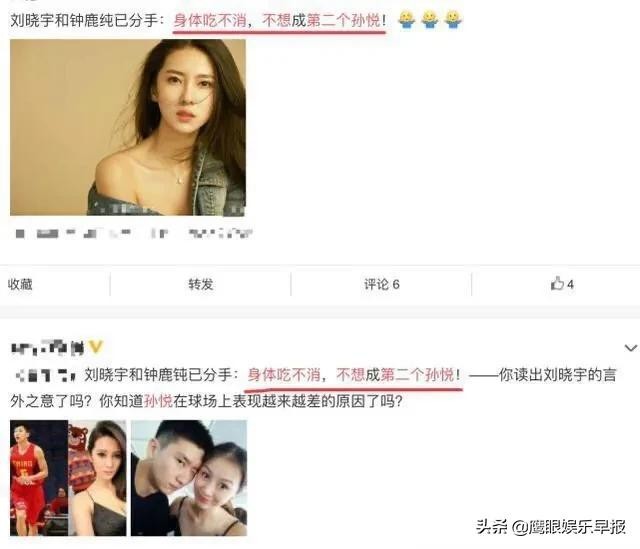 还记得王思聪曾经调侃自己找女友的标准就是“胸大的”,之后钟鹿纯也在微博恶搞般的表示:最希望收到前男友的死讯。曾有网友说过,除了财富外,王思聪无论是身高体能还是颜值,都无法和刘晓宇比,毕竟人家是篮球运动员,不过两人分手后,刘晓宇就说出原因:身体吃不消,不想成为第二个孙悦。