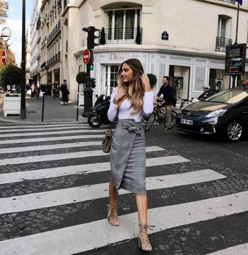 紧身的白色T恤好显性感身材,搭配高级灰色长裙和高跟凉鞋,优雅的街头风格可以如此简单的完成。长裙上蝴蝶结腰带配饰,不仅起到装饰作用,还很显女人味。