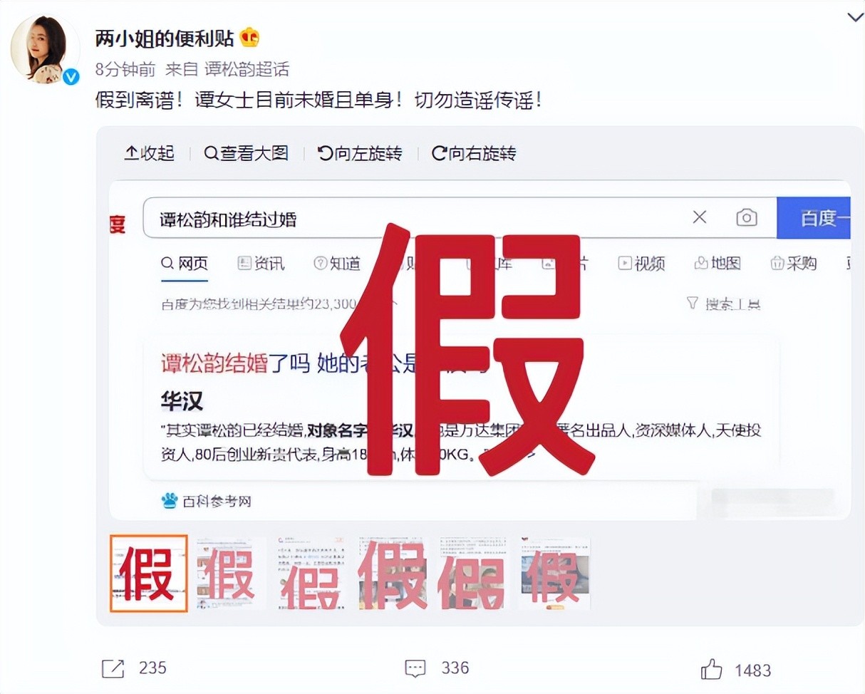 对此,谭松韵工作室晒出多张相关传闻的消息截图,在图上打上大大的“假”字,并配文称:“假到离谱!谭女士目前未婚且单身!切勿造谣传谣! ”以此打假。