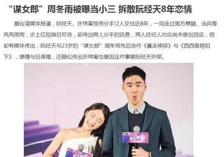 事后,周冬雨赞扬阮经天在戏里很善良,身体也好,表现出了很大的劲头。这一事件引发了巨大的轰动,因为当时阮经天已经与女友许玮甯交往了八年,到了快要结婚的阶段。周冬雨和阮经天的事情传开后,许玮甯对阮经天彻底死心,两人的八年感情也宣告结束。因此,周冬雨被指责为小三。