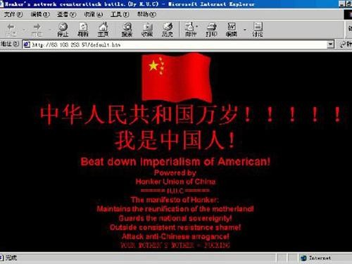 一年后的1998年5月8日,美国空军用导弹袭击了我国驻南斯拉夫大使馆,记者朱颖、邵云环和许杏虎遇难,还有二十多人受伤,三十多岁的人应该还记得当年这件事在国内激起了多大的愤慨,5月8日当晚美国驻华大使馆的管网就被黑,当晚十一点左右黑客们攻击白宫网站后更改了白宫管网的主页,点开网战就是对美国军方的谴责页面。