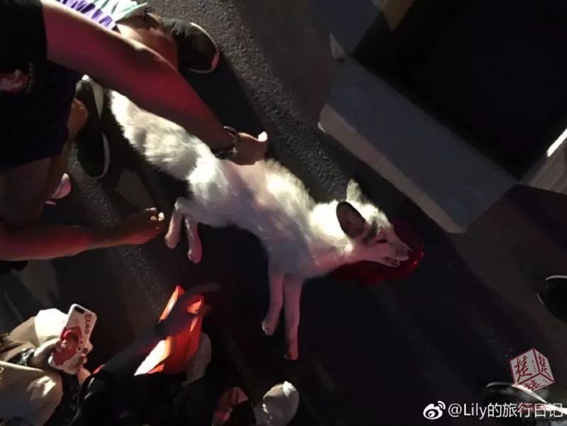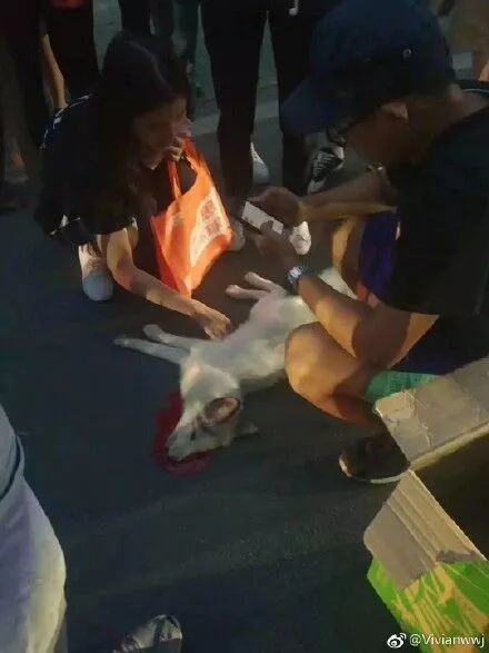 突然,两辆车驶过,同学们看到白狐躺在一片血泊之中。见白狐受伤,现场多位同学纷纷上前将它围住,白狐当时抽搐不已。