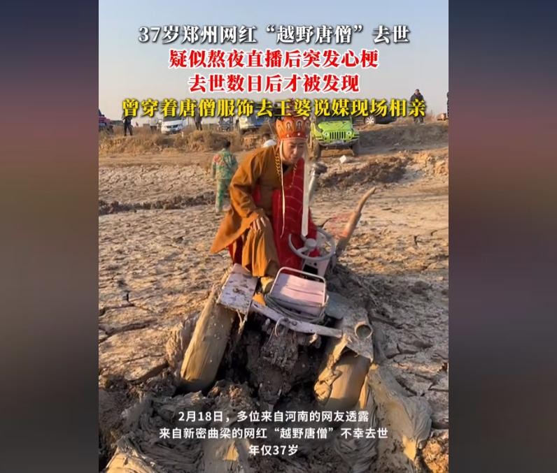 这两天,“郑州网红唐僧猝死”的消息冲上热搜,2月18日网友爆料称,以扮唐僧走红的越野主播突然离世,家属用其手机发布的朋友圈显示,这位本名未公开的37岁男子已于2月19日举行葬礼。