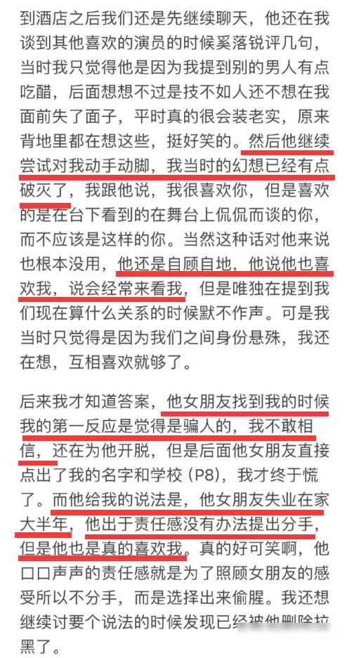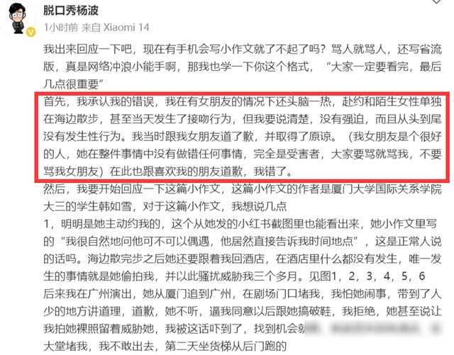 女粉丝不甘受委屈,公开了与杨波的聊天记录以及在酒店的私密照片,证实了两人曾在酒店一同共度时光。杨波在一篇长文中公开道歉,承认自己在有女友的情况下的不当行为,但强调没有强迫,并表示已向女友道歉并得到原谅。他还呼吁大家不要责骂女友,将她视为受害者。