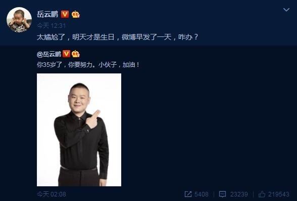 岳云鹏对自己说:“你35岁了,你要努力。小伙子,加油!”几个小时后,岳云鹏似乎醒悟过来:“太尴尬了,明天才是生日,微博早发了一天,咋办?”无数网友留言支招,经常一起合作的相声演员孙越则回应:“你知道明天和意外哪个先来。”