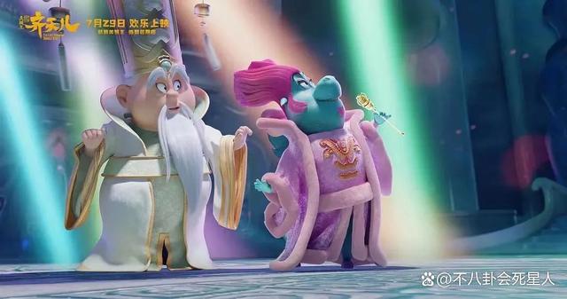 就是这样的龙王,在这部电影里可谓是 " 大变样 ",他扎着粉色的发髻,连胡子都是粉色的,化着粉色的眼影,手拿仙女棒,身穿羽毛长袍,住在自己粉色的的闺房中,是个妥妥的女装大佬。
