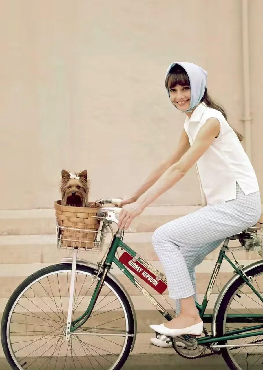 赫本骑着脚踏车,带着狗狗去兜风,这狗头上还有朵小花呢!狗狗的镜头感也不错哦。