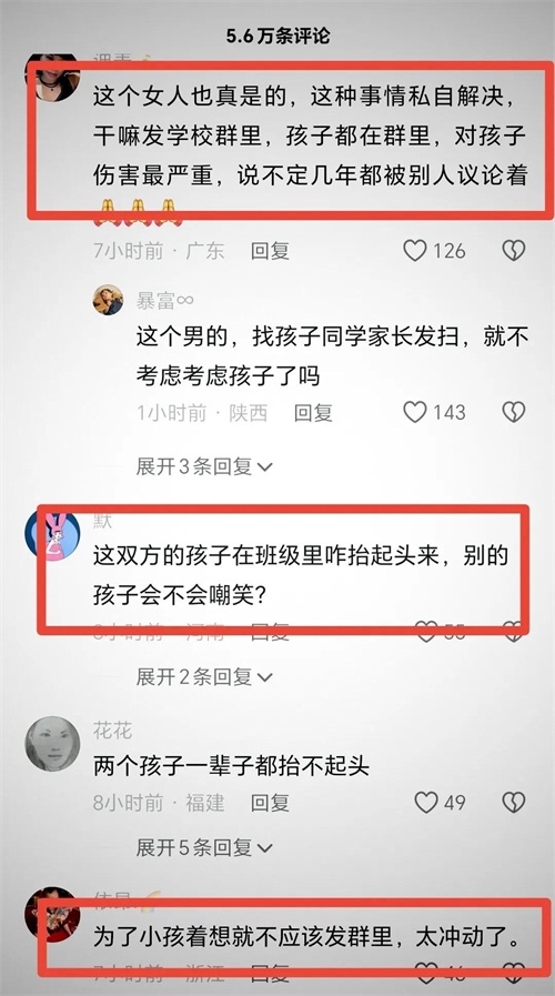 与此同时,有家长表示对这种情况感到无奈,觉得这种突发的“班级群风波”让人无辜的孩子卷入其中,指责家长们太冲动了。
