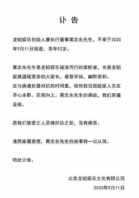 2020年,9月11日,龙韬娱乐发文称黄子韬的父亲黄忠东今日病逝,享年52岁,其丧事将遵照家属意愿,一切从简。