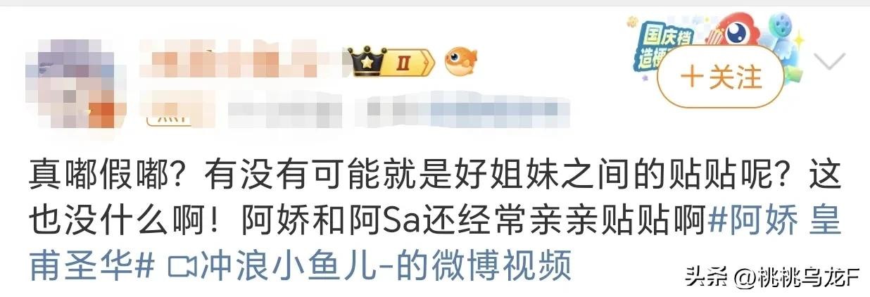 然而,也有人对此进行辩解。“对好姐妹的祝福罢了,你们别太敏感了,美女直得很”他们认为阿娇和皇甫圣华的亲密举动并不能证明两人正在恋爱。毕竟,在娱乐圈中,亲吻和庆生都是闺蜜之间常见的示爱方式。对于阿娇和皇甫圣华来说,可能只是姐妹之间的贴近和亲密表达,并不存在恋爱关系。