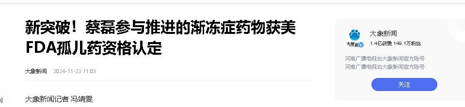 并且在11月23日,有记者了解到蔡磊在渐冻症研究领域有了新的突破,他的团队推进的渐冻症药物已经过得了美国食品药品监督管理局的认定。