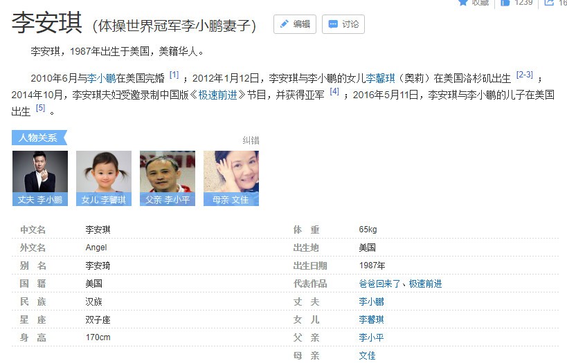 李安琪,女,前体操世界冠军李小平和前体操队公认美女文佳的女儿,在美国长大。2010年6月3日,体操名将李小鹏与李安琪在美国举行婚礼。也受到广大观众喜爱。