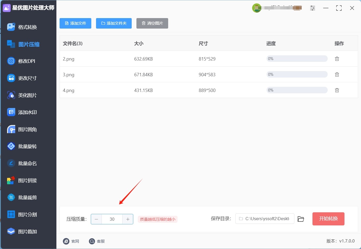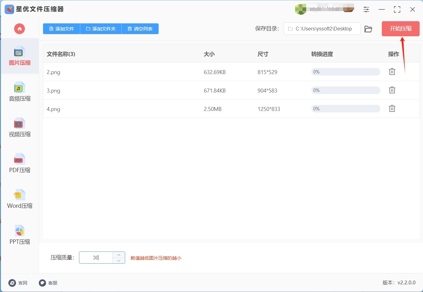 步骤4:确认好【压缩质量】设置后,请点击软件右上角的【开始压缩】按钮,点击这个按钮就可以启动图片压缩程序了。