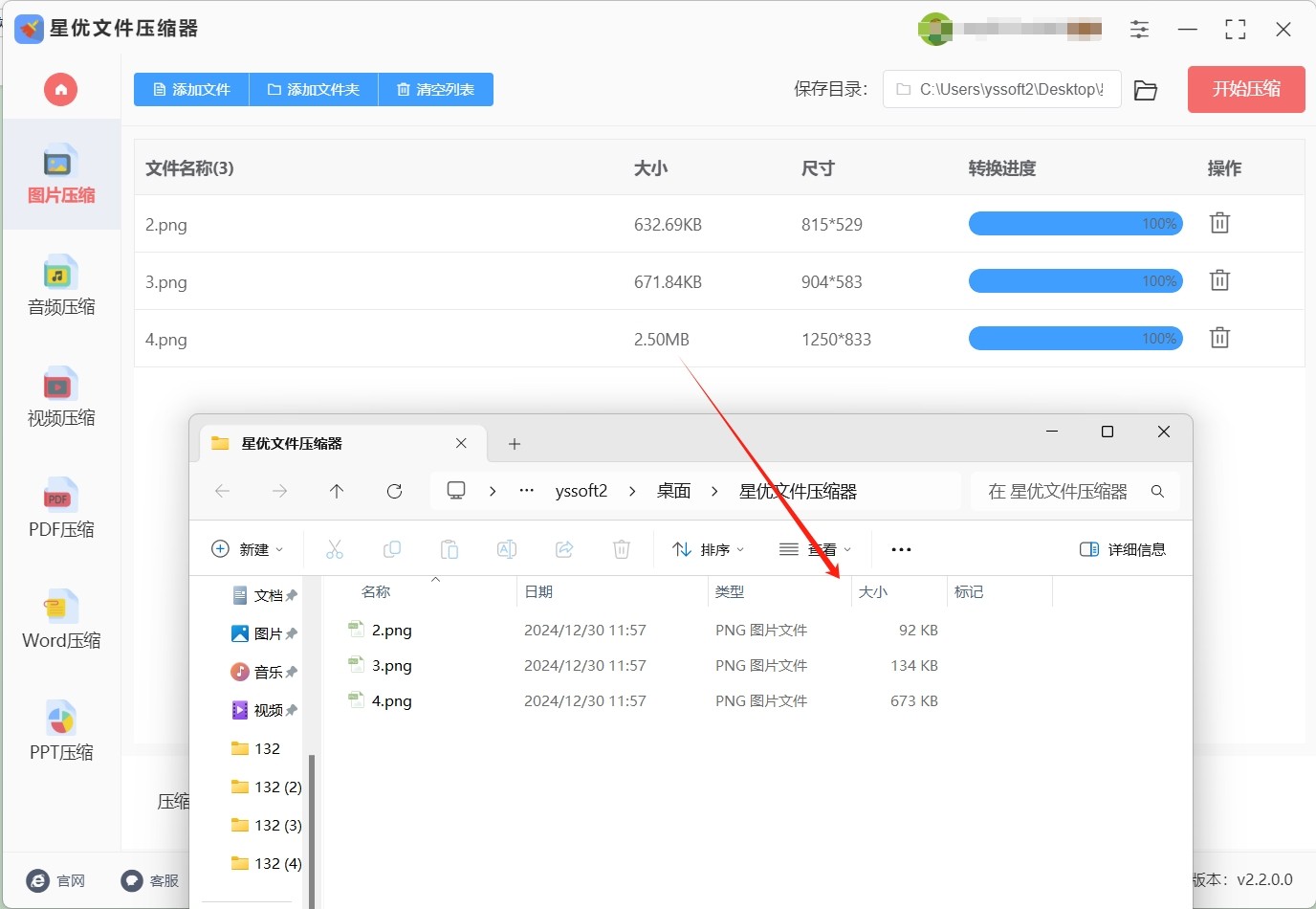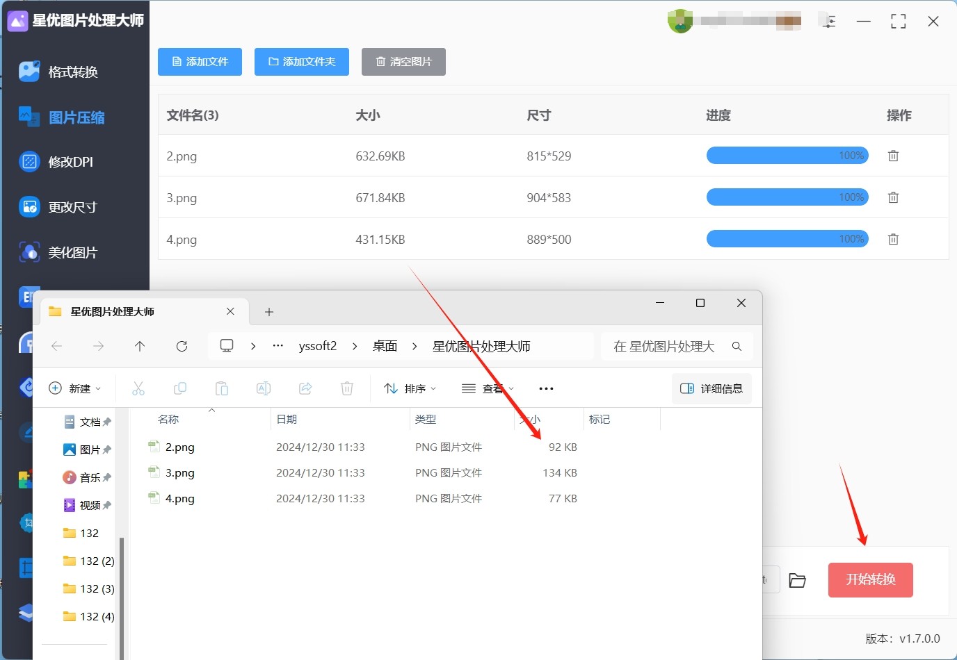 步骤4:设置好压缩品质后,点击界面右下角的【开始转换】按钮,以启动压缩过程。待所有照片压缩完成后,软件会自动打开输出文件夹。在输出文件夹中,您可以找到已压缩的照片。通过对比我们发现,使用“星优图片处理大师”压缩图片kb的大小,便捷又高效。
