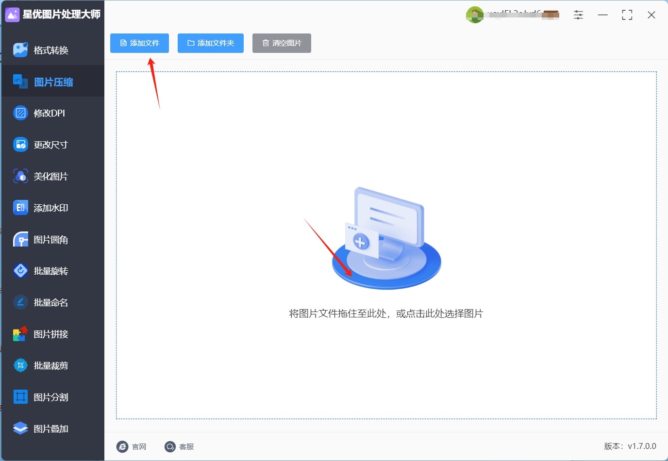 步骤2:准备好您需要压缩的照片。如果需要压缩多张图片,建议将它们集中存放在一个文件夹中以便于操作。在软件界面中,点击【添加文件】按钮。将所有待压缩的照片导入到软件中,这有助于提高批量压缩的效率。