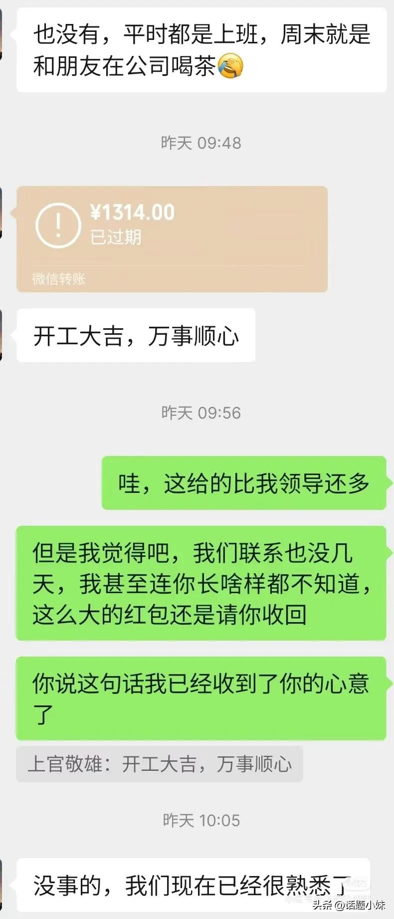 今天我开工,他一下子给我发了个1314,我也没敢收。到目前为止面都没见过,万一不合适,这个钱他肯定是要回去的,我可不想自找麻烦。