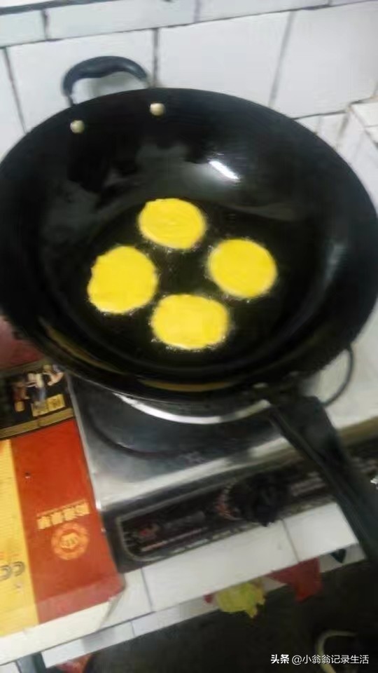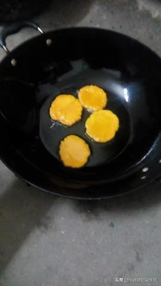 3、将搓成团的南瓜饼分成平均的小团,再压成小园块,然后放入油锅中慢火煎,煎至一面金黄后再翻另一面继续煎至金黄。