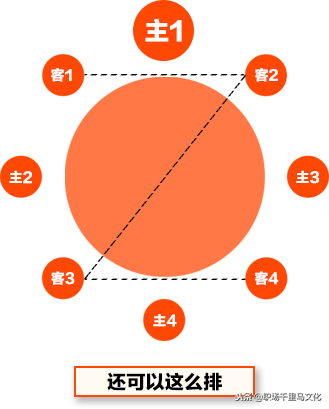 如果是西餐,餐桌不同,因此,座次也有所改变。可参见下图的座次排列: