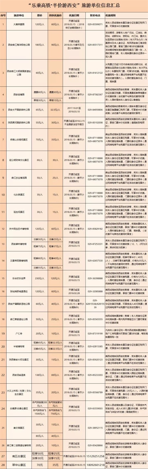 西成高铁开通后,乘坐西成高铁至西安的游客,凭本人高铁票和本人身份证在景区购票,可享半价优惠哦,赶紧买票吧。