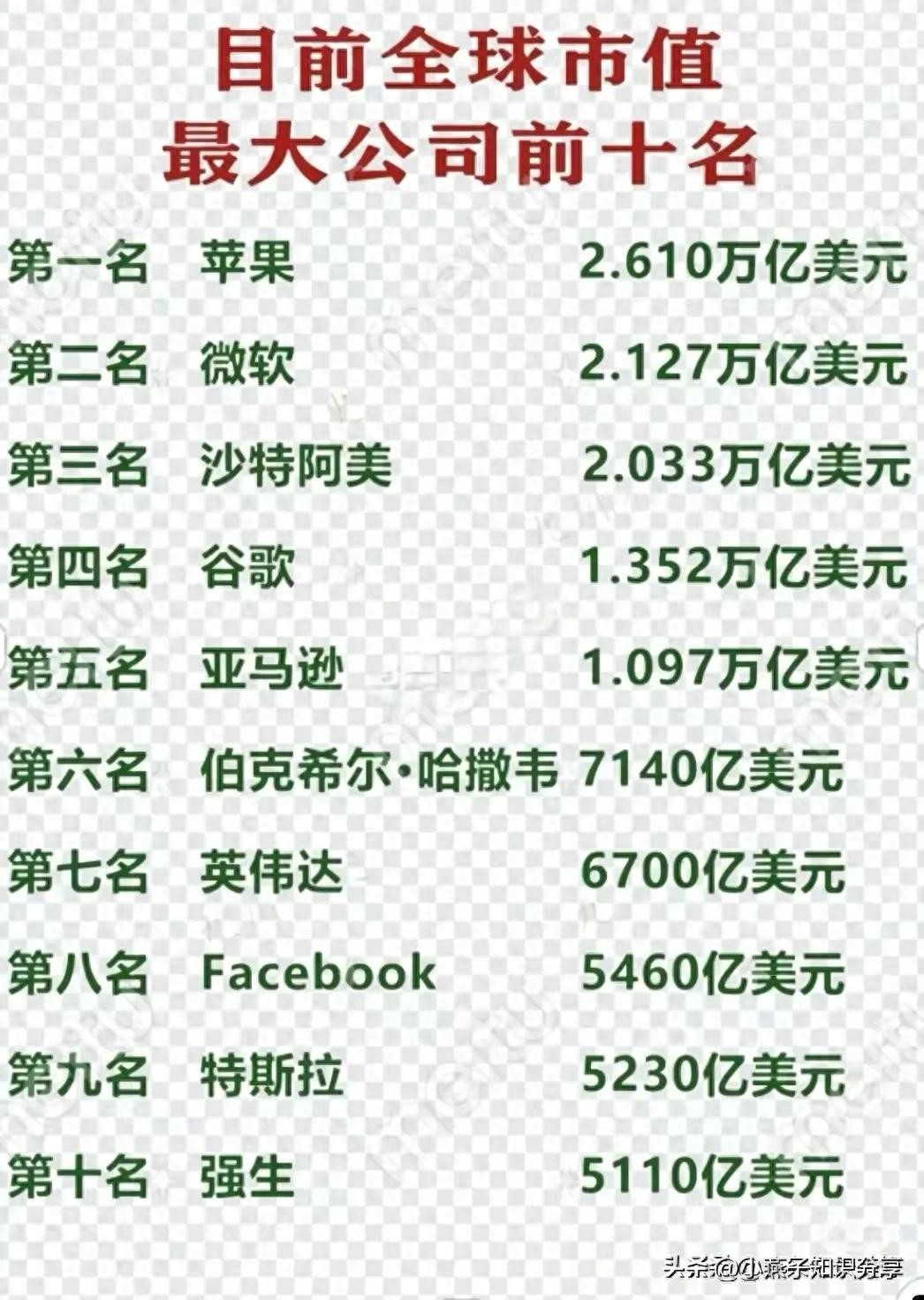 目前全球市值最大公司前十名,终于有人整理出来了,收藏看看
