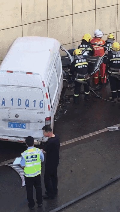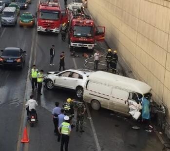 今天早上5点半左右,西安环城西路玉祥门下穿隧道发生了一起两车相撞的严重交通事故。一辆白色SUV与一辆面包车发生碰撞,面包车损毁严重。