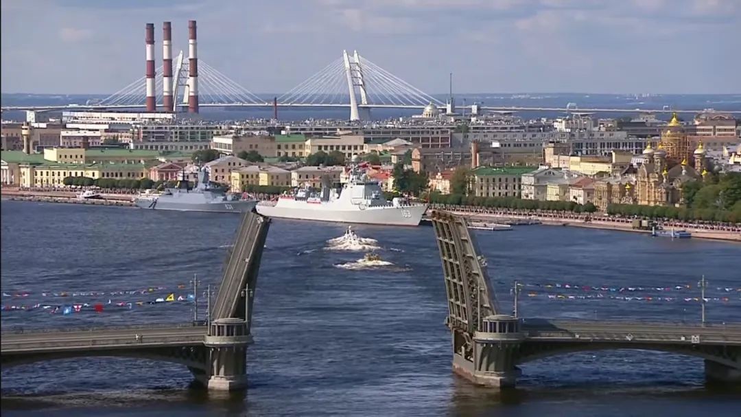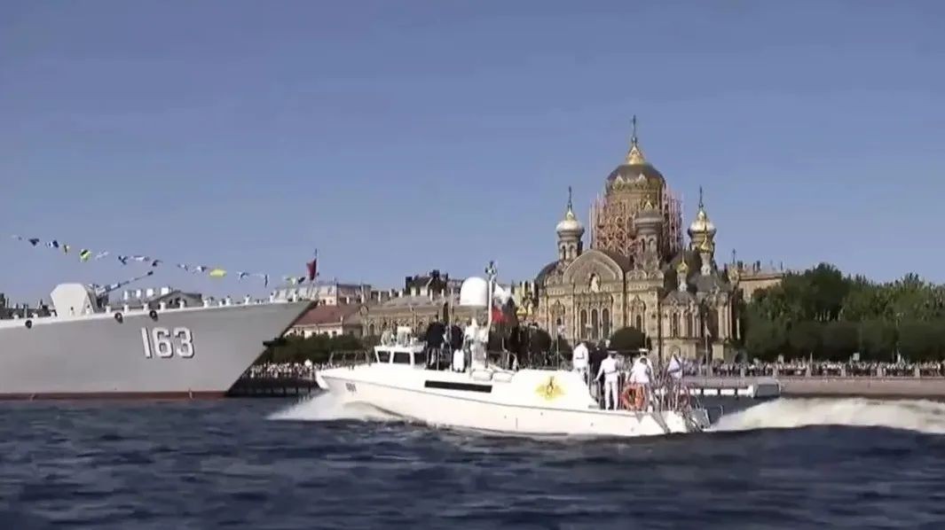 当地时间11时,20多艘来自俄各个舰队的水面及水下舰艇排列在圣彼得堡涅瓦河上,依次接受检阅。