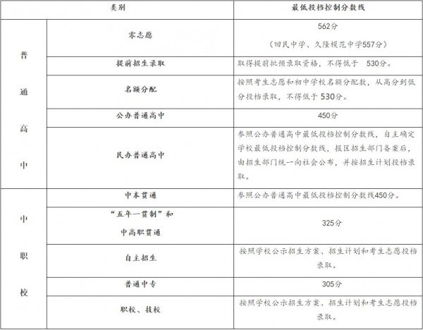 2019年本市高中阶段学校招生最低投档控制分数线公布如下: