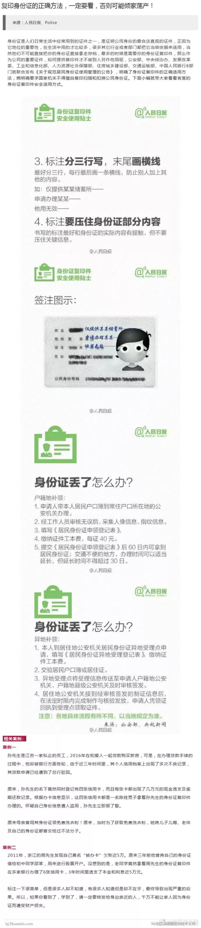 【复印身份证的正确方法,一定要看,否则可能倾家荡产!】身份证作为公民的重要证件,如何提供复印件才不被别人另作他用呢,公安部、中央综治办、发展改革委、工业和信息化部、人力资源社会保障部、住房城乡建设部、交通运输部、中国人民银行8部门就联合发布《关于规范居民身份证使用管理的公告》,明确了身份证复印件的正确适用方法,病明确要求国家机关不得擅自复印扫描和扣押公民身份证。下面小编就带大家看看官宣的身份证复印件安全适用方式。