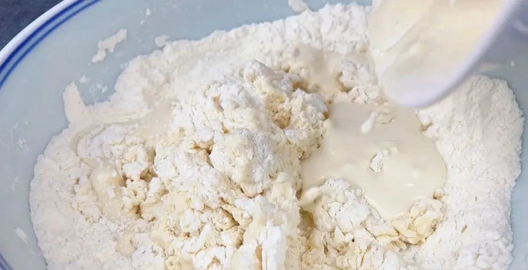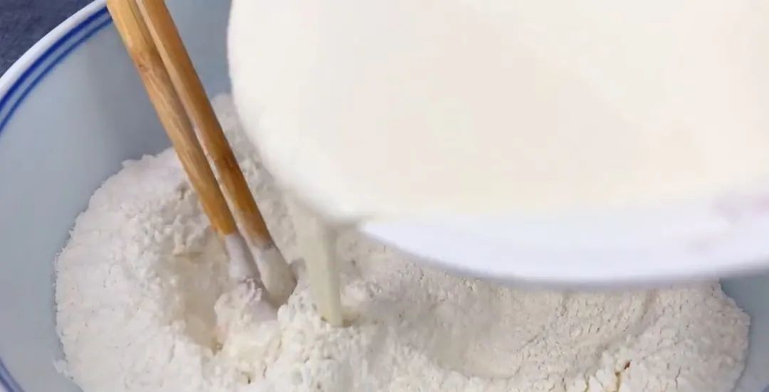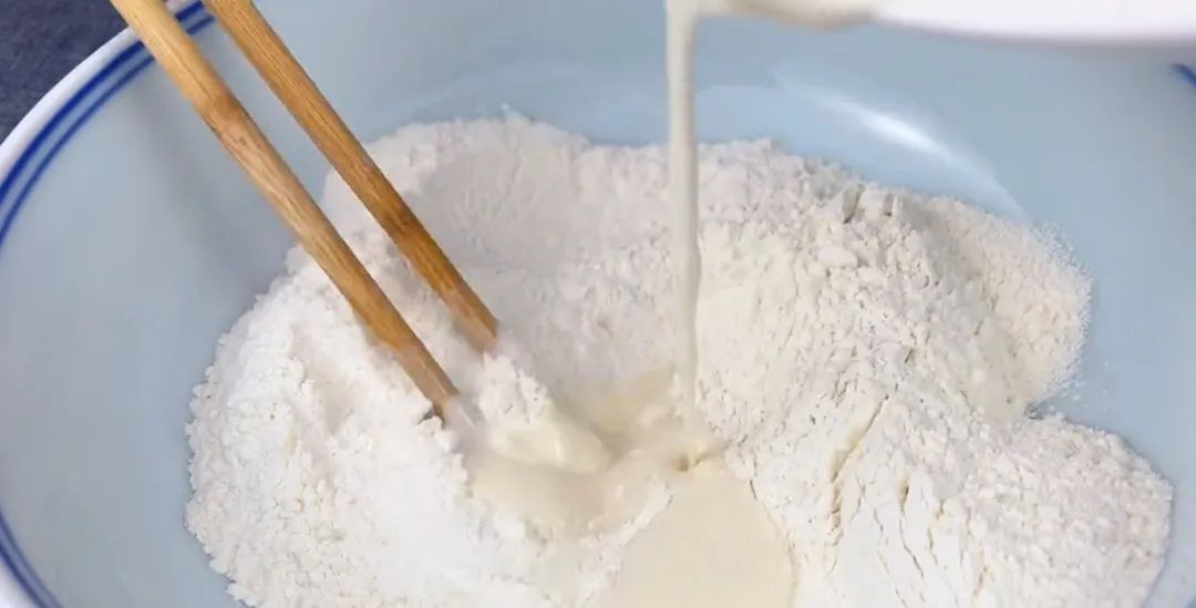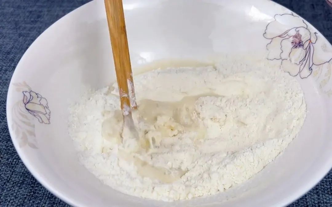 面粉大概100g左右,准备60ml的凉白开,倒入面粉中,一边加一边搅拌。