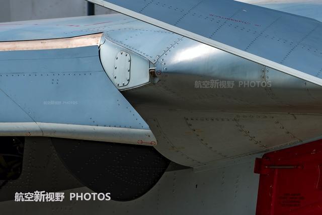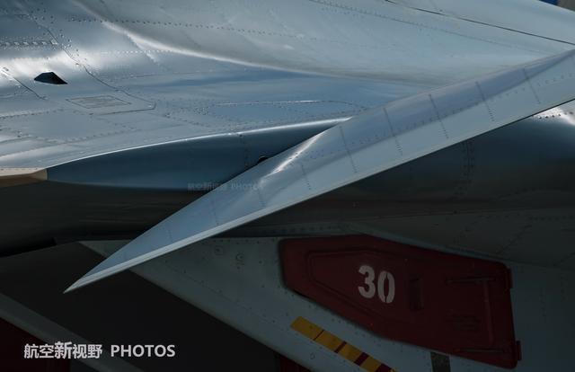 苏-30SM战机机翼前缘特写,个人感觉相比于传统老旧的苏-27战斗机,这架战机的工艺水平还是相当精致的。