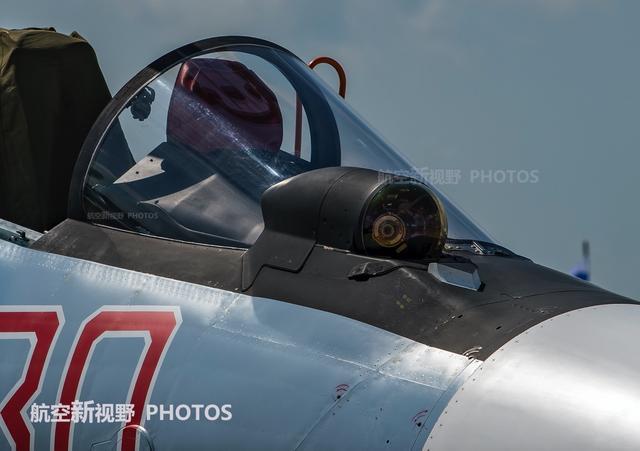 苏-30SM战机座舱盖特写,可以看到座舱内部的仪表飞行时的布帘。