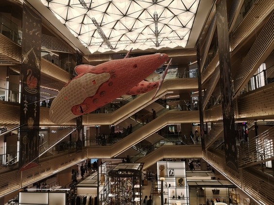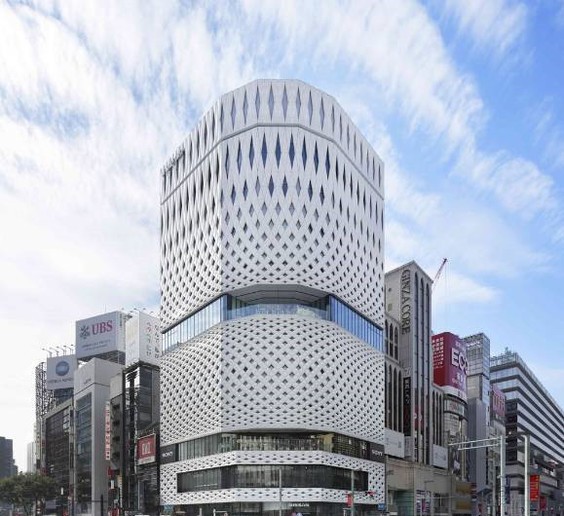 Ginza Place 是东京银座商业区,近年来最引人注目的建筑,立面的灵感出自日本传统工艺品中开放格子形态的透雕(sukashibori)。通常运用在类似篮子或者餐具之类的小物件上,幕墙的网格系统逐渐扩大以适应建筑的尺度。这个系统通透性使得幕墙可以自由开启和闭合。灵活的建筑表皮分布在不均匀的建筑体量上,将大片的幕墙划分为无数个独立的小幕墙。