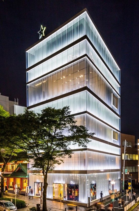 其中,妹岛和世&西泽立卫设计的Dior表参道旗舰店非常吸引我,他们是日本第四位获得普利策奖的设计师。Dior表参道店特别醒目,建筑物通体白色,表层位透明玻璃,可透过玻璃看到里层的丙烯板的褶皱和建筑的内部结构,丙烯板内层通过喷涂白色调整透明度。晶莹剔透又淡雅延续,显然是日本美学的提炼。双层设计方案,在高透明层压玻璃内侧,装上裙褶一样的丙烯板。据妹岛解释,“迪奥的产品资料中有非常漂亮的带褶女装照片,由此联想到了像布一样柔软的设计”。