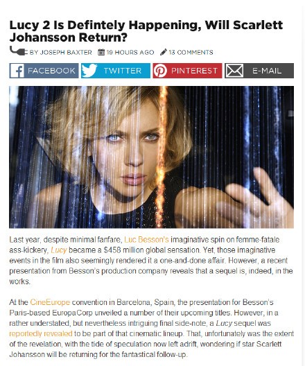 而电影上映时间,预估是接近年底,也就是说,我们将不会看到《黑寡妇》和《超体2》的斯嘉丽德比——是的,我猜斯嘉丽·约翰逊一定会回来,毕竟《超体》就是《Lucy》,而露西只能是斯嘉丽·约翰逊(当然,Lucy也是那只最早的古猿,电影里有),否则票房会教主创做人。