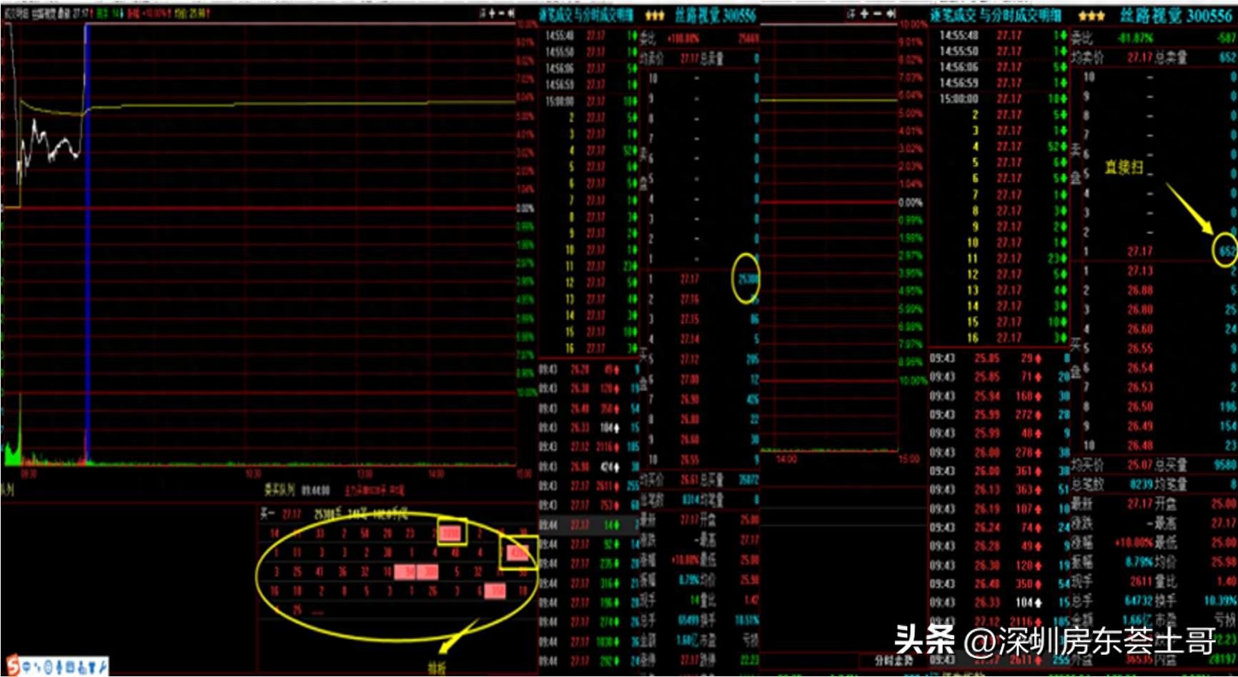 举例说明排板和扫板,以 2018 年 5 月 25 日的丝路视觉二板涨停板为例子,见图,左边是排板,右边是扫版