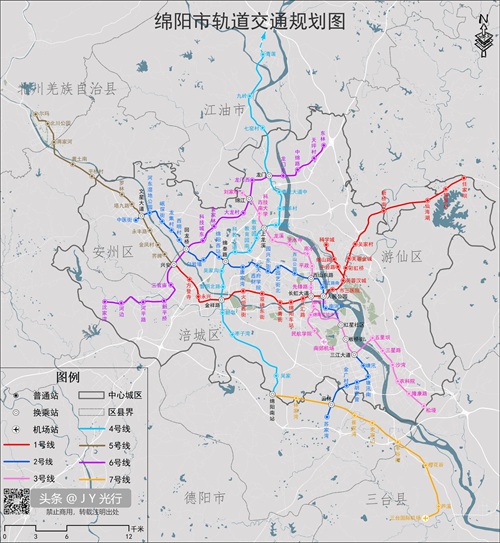 线网涉及7条线路,1~6号线是城市主干线,7号线是新机场连接线,4号线北段预留江油城区方向的延伸线。整个线网主要位于涪城区、游仙区和安州区范围内,另有江油市涉及4号线、三台县涉及7号线,北川县涉及5号线,全长200km+。