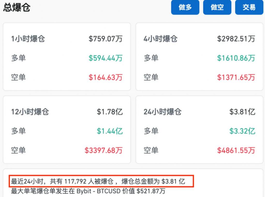 根据加密货币检测网站 coinglass 数据,最近 24 小时有约 11.7 万人爆仓,爆仓总金额为 3.81 亿美元。