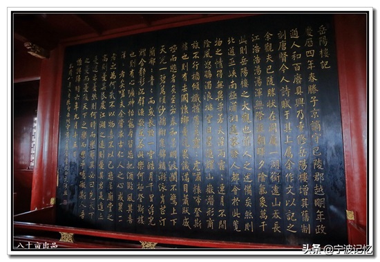 《岳阳楼记》是北宋文学家范仲淹应好友巴陵郡太守滕子京之请,于北宋庆历六年九月十五日(1046年10月17日)为重修岳阳楼写的。 一楼大厅由12 块紫檀木板组成,黑底绿字,是清道光四年(1824 年)巴陵姓吴的知县叫人按照原件笔迹仿制的《岳阳楼记》。