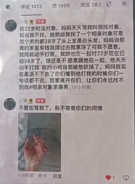 2024 年 11 月 20 日,网民 " 小葵 " 在某短视频平台发布视频,视频文案内容称其被家人逼迫 " 嫁人 ",婚后遭 " 家暴 "" 砍断小手指 " 等,并在评论区附受伤手指图片。