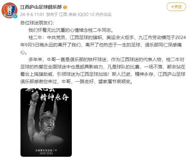 @江西庐山足球俱乐部 也发文悼念:凡是球队的比赛,他一场不落,都会站在看台上摇旗助威,引领球迷为江西足球加油!牛哥,一路走好,望家属节哀顺变。