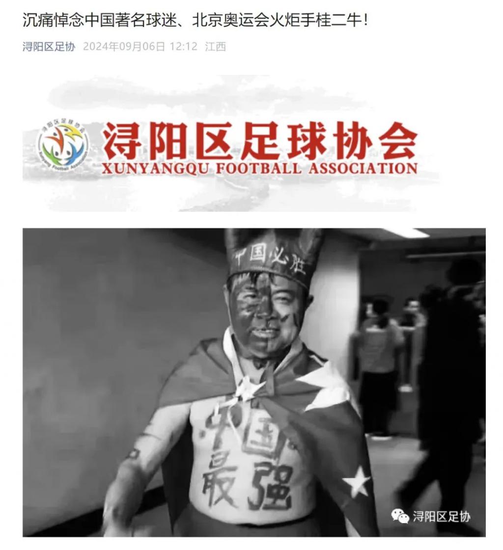 据江西浔阳区足球协会 9 月 6 日消息,中国著名球迷、北京奥运会火炬手桂二牛于 9 月 5 日晚 11 时 40 分因病去世。