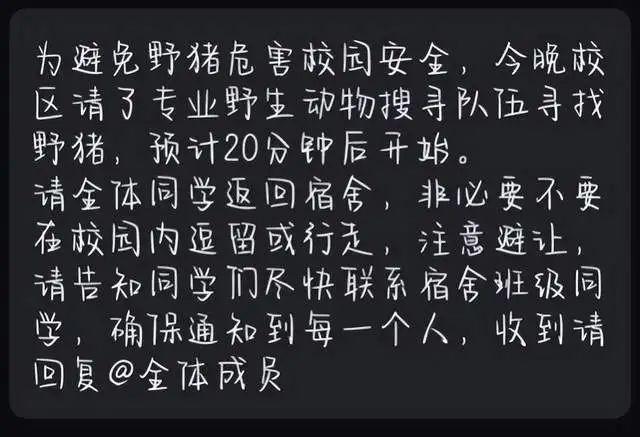 发布者在评论区中表示,21 日晚,学校叫来专业野生动物搜寻队伍寻找野猪,要求学生尽量不要在校园内逗留。